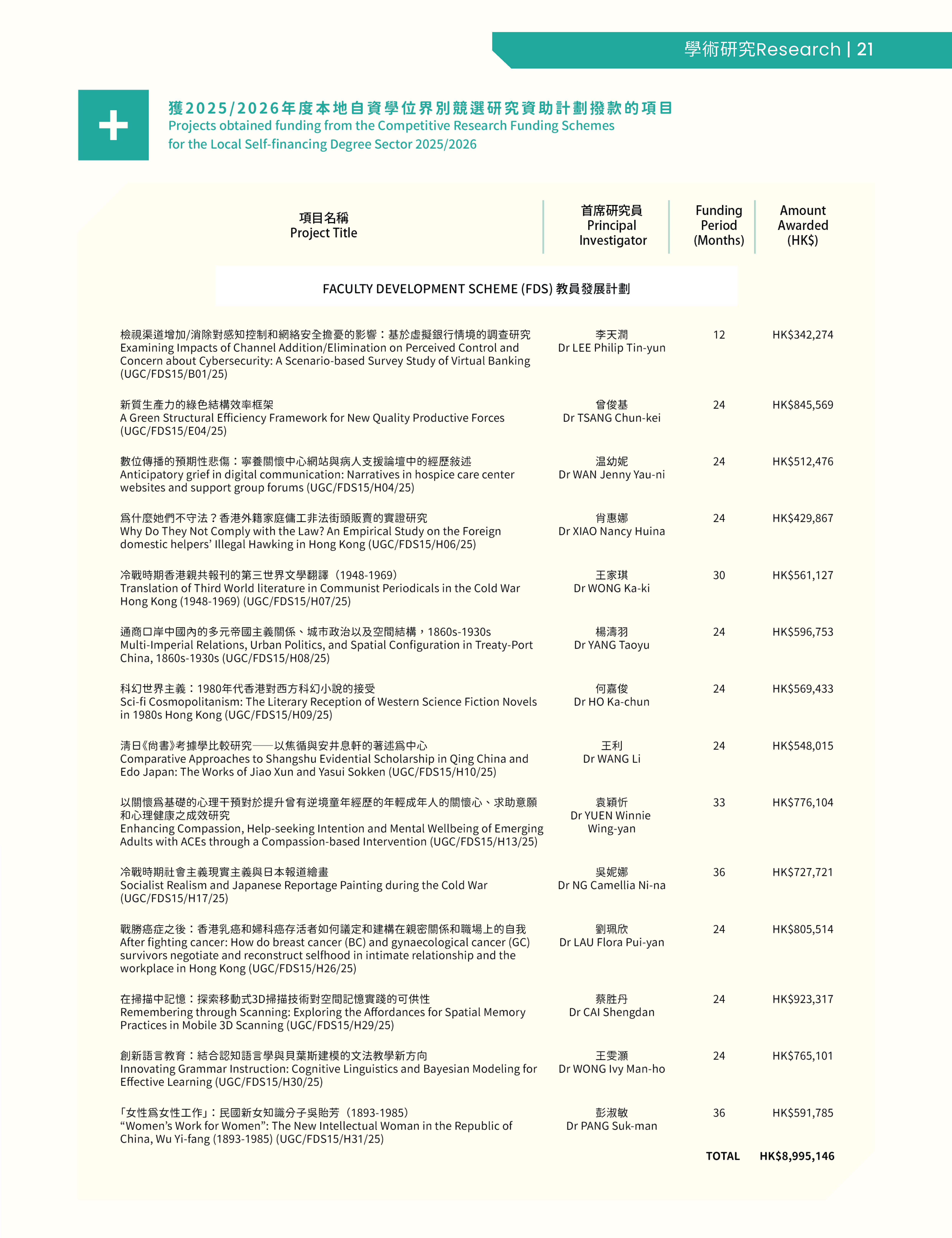 Dr Alex LI Wang-on, HKSYU Associate Academic Vice President (University Research), said this year’s results continue the University’s strong tradition in the humanities and social sciences. Funded projects cover areas such as digital communication, innovative language teaching, and a study on spatial memory practices in mobile 3D scanning. Research on Chinese history and literature has also expanded significantly compared with last year, with newly funded topics including the translated literature in Hong Kong during the Cold War period, and a pioneering woman intellectual in early twentieth-century China. Meanwhile, successful projects in virtual banking and ESG-related issues reflect the university’s commitment to interdisciplinary collaboration and a more diverse academic strength.
