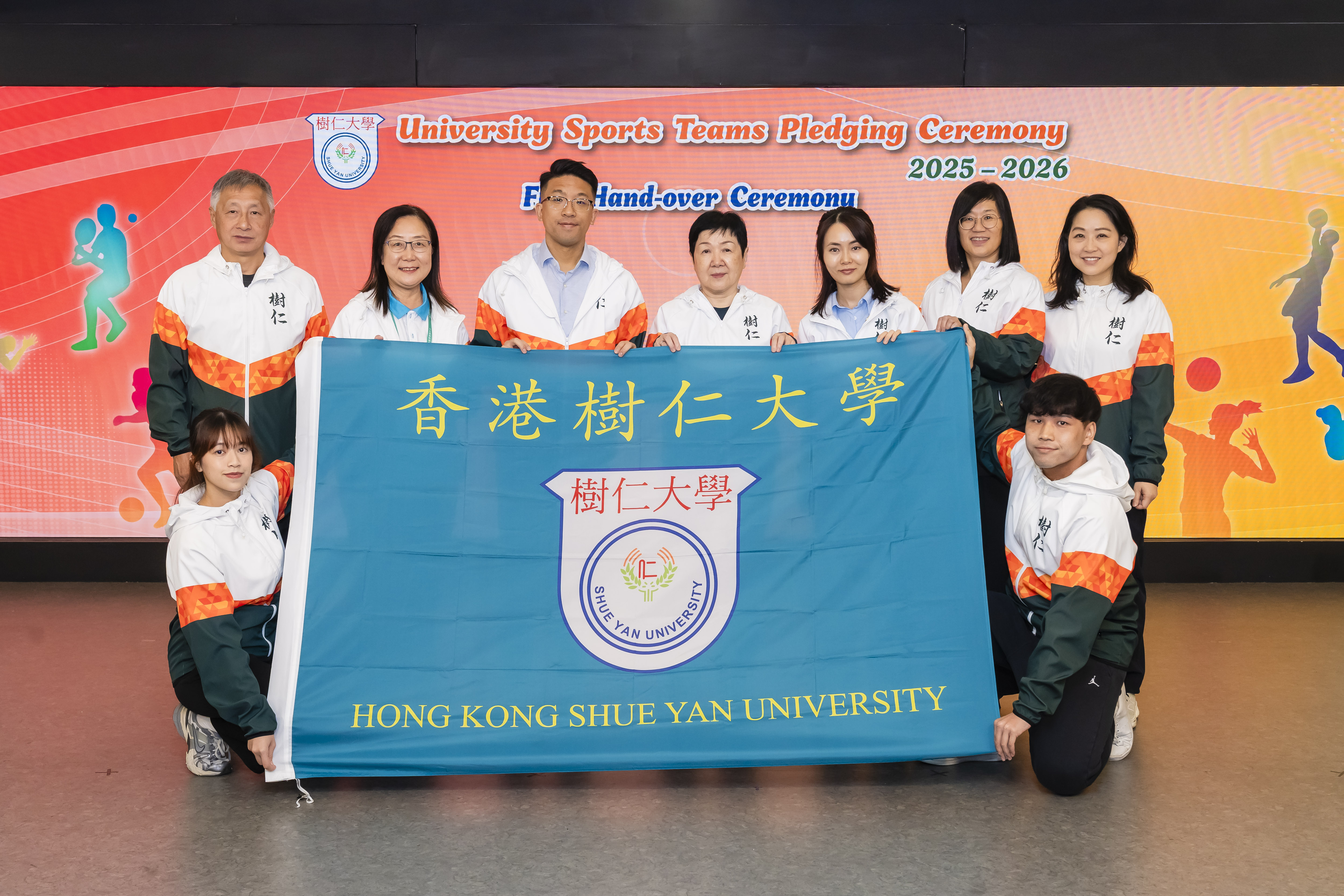 Highlight was the symbolic flag handover ceremony, led by Professor Sun Tien-lun, Senior Vice President; and Dr Gong Xiao En, the Director of Physical Education. Two student representatives received the school flag, symbolizing their responsibility to represent Shue Yan with pride and to pursue excellence in every match.