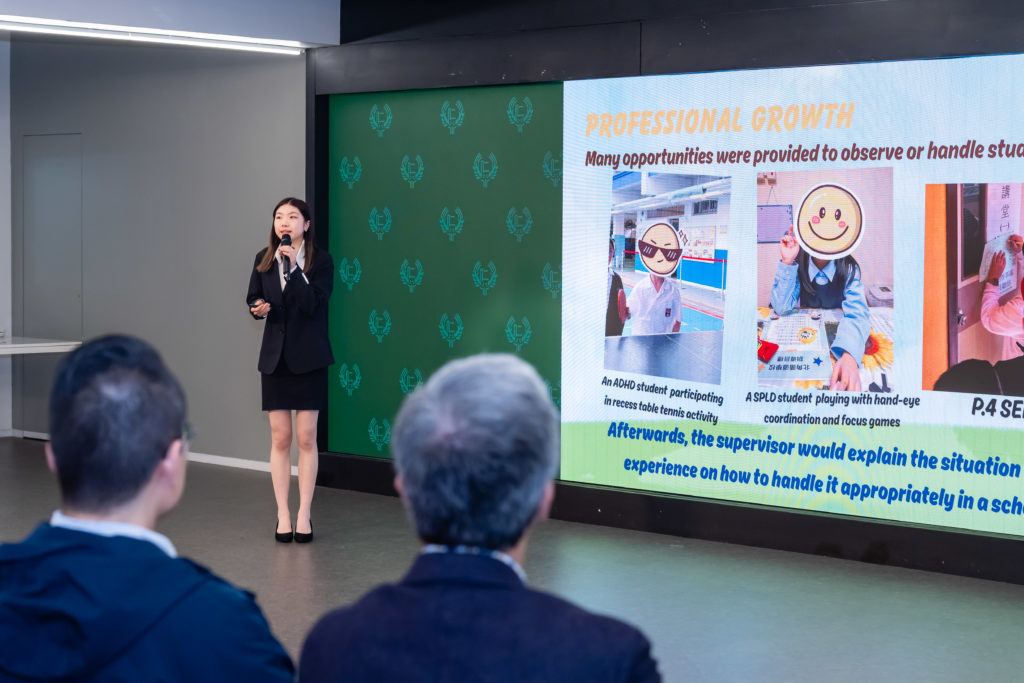 三名獲頒「傑出實習表現獎」的輔心系學生分享實習經驗。曾在北角循道學校實習的四年級生Michelle感恩獲得實習機會,讓她學習如何觀察,處理不同學生的需要,並增強與學童的相處技巧。