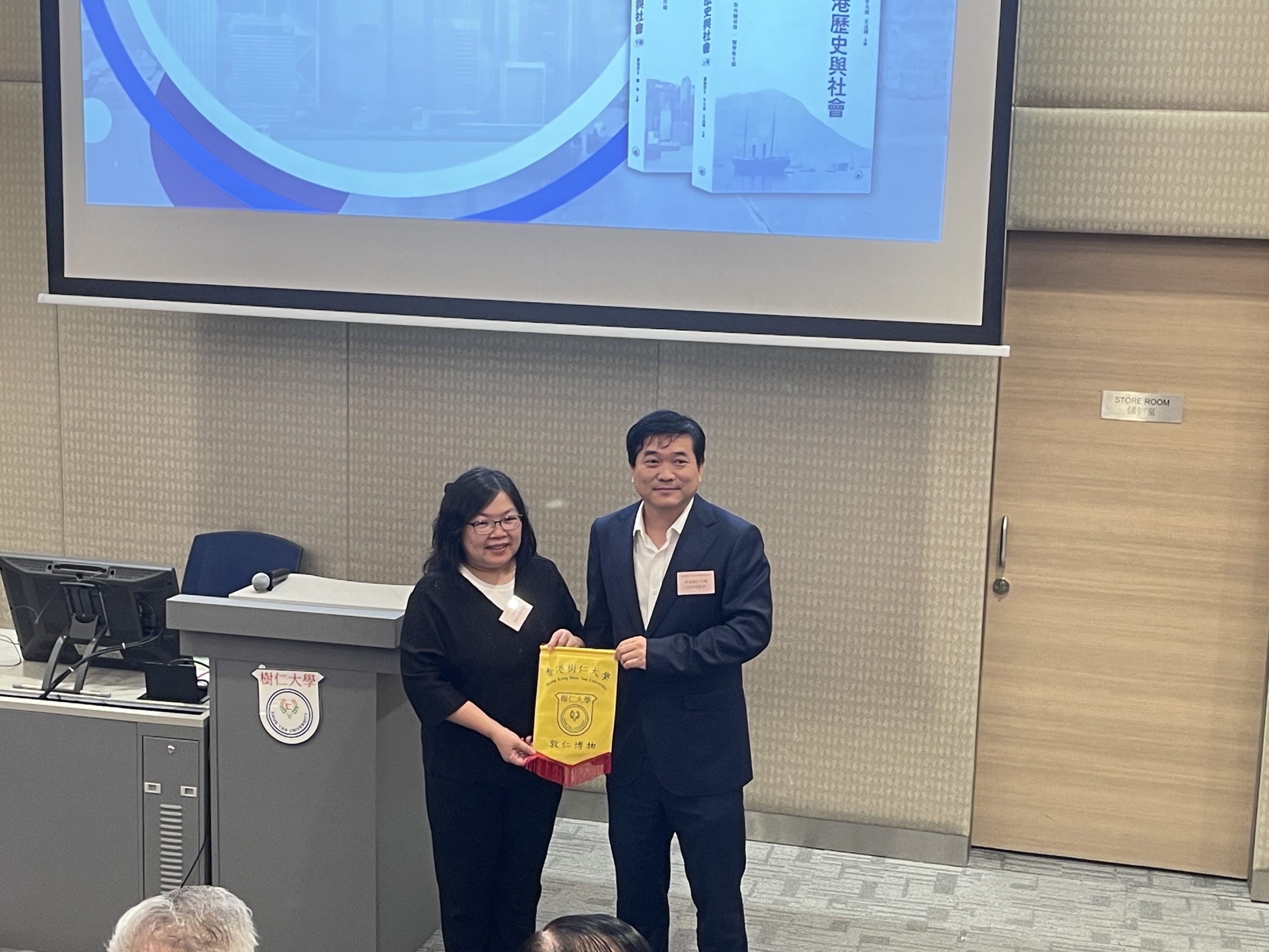 仁大歷史學系系主任何其亮教授(右)頒發感謝旗。