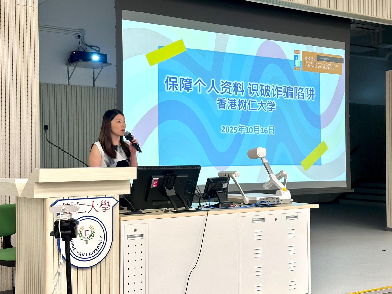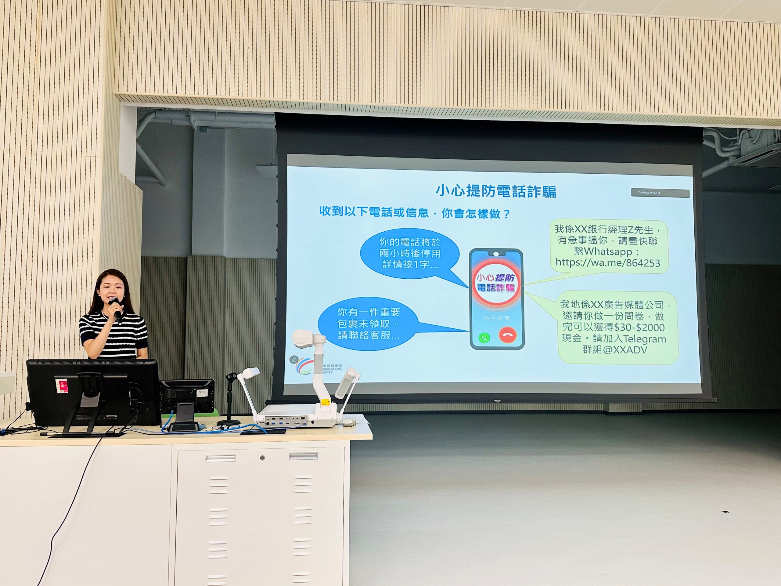 通訊事務管理局公共事務經理林珏妍女士亦以「電話詐騙要小心 反覆求證最安心」為主題,並分享了真實電話詐騙案例,及提供實用防騙建議,增強內地生對電話及短訊詐騙的警覺意識。而私隱專員公署企業傳訊總監周映彤女士向內地生分享精明使用智能電話、即時通訊軟件和社交媒體以保障私隱的貼士。