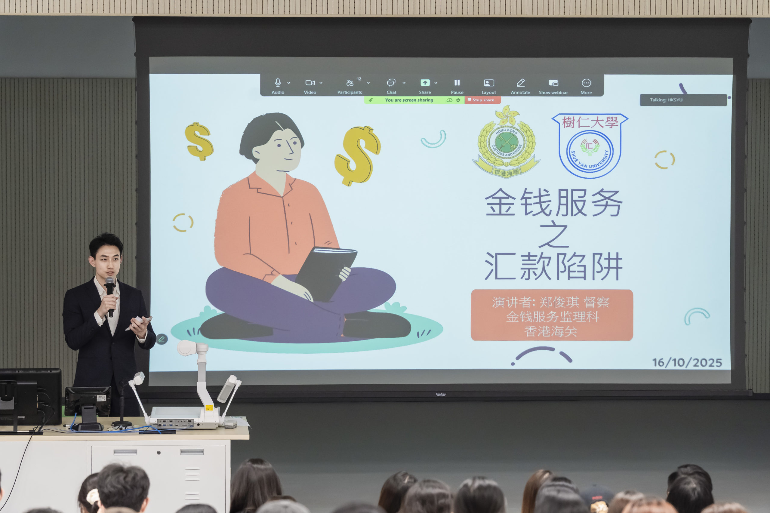 香港樹仁大學學生事務處與國際及大中華學生支援辦公室於2025年10月16日合辦「生活防騙全攻略:匯款、禁運、電話陷阱與個人資料保護」講座,分享實用的反詐騙知識,藉此提高內地生的警覺性,識別及應對各類騙局。仁大協理副校長(學生事務)葉秀燕女士、國際及大中華學生支援辦公室總監陳天俊先生,與超過200位內地生出席參與。