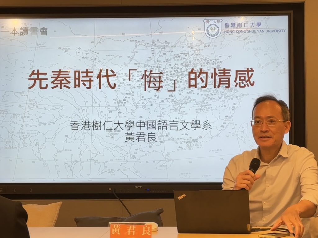 黃君良博士以先秦時代「悔」的情感為講題。他向《樹仁簡訊》介紹,研究先秦時代「悔」的思想比較少。這項研究聚焦於「悔」在中國文化背景下的道德文化涵義——作為一種道德情感,「悔」以愧疚、絕望、悲痛及憤恨等負向情緒作為驅動力,促使主體反省並改正錯誤,培養道德自律,提升德性內涵和人生智慧。