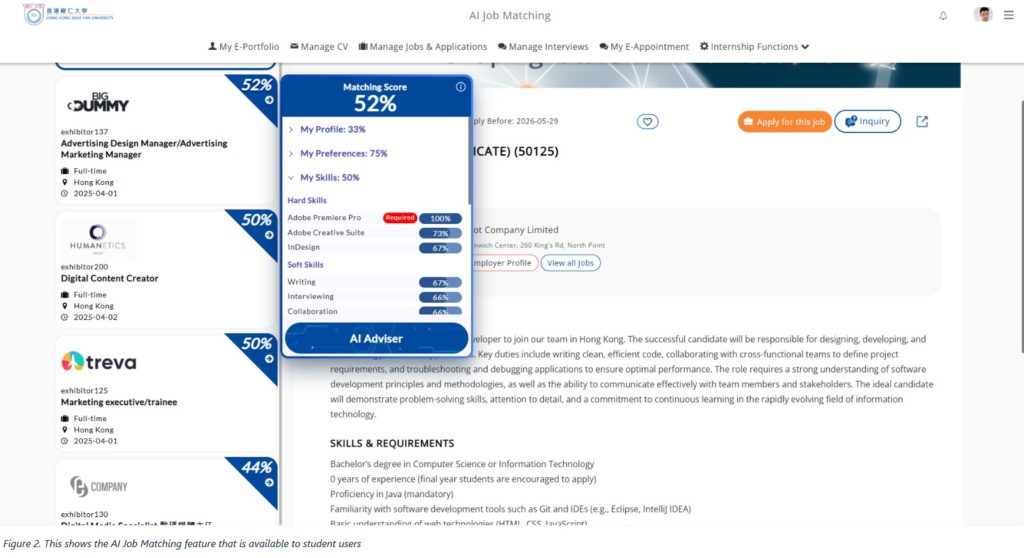高級程序員鄧慶柱先生補充說,在人工智能(AI)幫助下,學生可針對心儀工種生成合適履歷,系統亦會根據求職者的履歷,推薦合適職位空缺。「學生求職速度將加快,機會亦會增加」。他坦言,以往求職需主動出擊,平台則讓學生能更「被動」地獲取機會。除了學生,行政與學術部門也能得益,透過整合分散資源,提升部門間協作效率。
