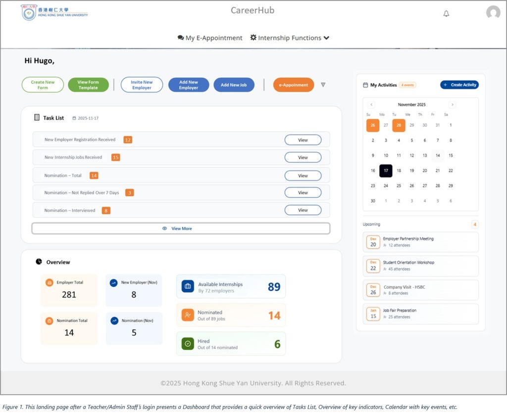 談及創作緣起,徐東博士表示,最初發現學生事務處、工作實習辦公室及環球事務中心各有獨立的資料庫,僱主與實習資料未能互通。他認為部分資源可共同使用,於是構建一個整合實習、求職與就業資訊的平台,促進師生與僱主之間的聯繫,提高效率。