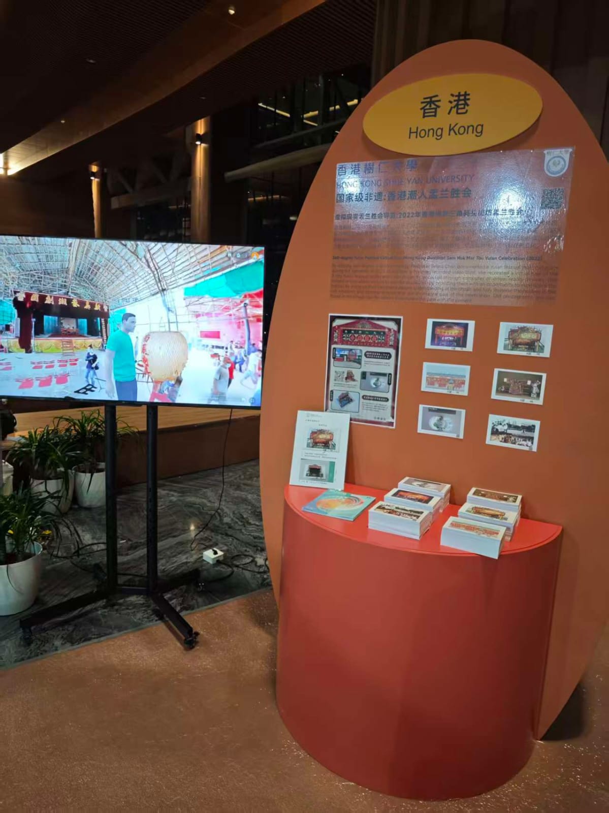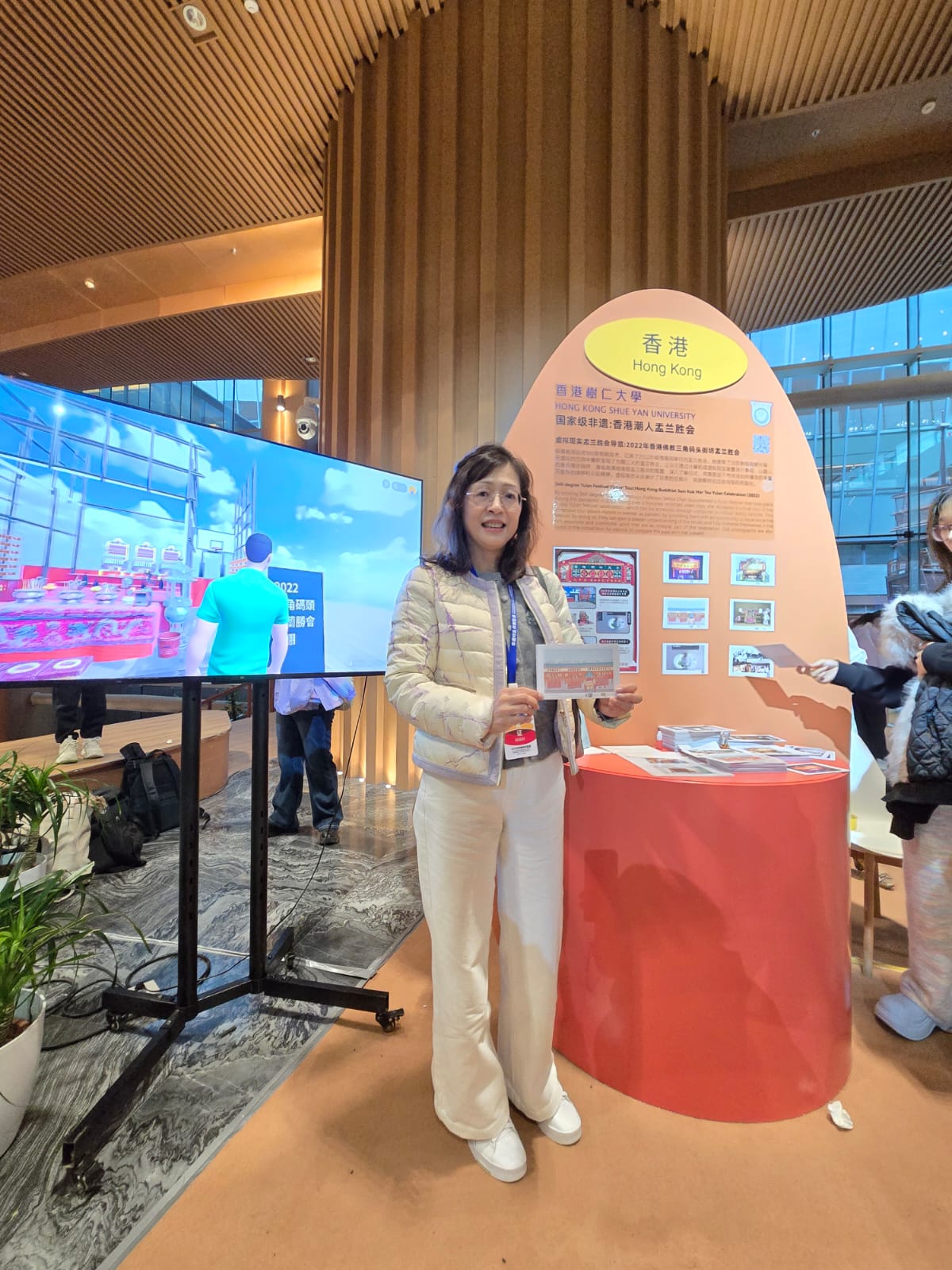 為期五天的展覽期間,陳蒨教授利用創新的數碼化展示方式——虛擬導覽系統(Virtual Tour)、虛擬博物館(Virtual Museum)和擴增實境(AR)明信片,向國際觀眾呈現這傳統民俗活動的深厚文化內涵。此外,她又與仁大社會學系陳麗碧教授和柯平川博士在專題展區現場,親身解說非遺數碼化保護領域的前沿成果。專題展區的亮點是虛擬導覽系統與虛擬博物館,特別研發的AR明信片吸引參觀者駐足體驗。這些明信片記錄2023年尖沙咀官涌街坊盂蘭勝會的神棚、經師棚、戲棚等場景。通過手機掃描二維碼,傳統的戲棚、神棚和紮作藝術以立體動態形式呈現在觀眾眼前,實現科技與傳統文化的完美融合。這種創新展示方式不僅讓古老文化遺產以嶄新形式獲得新生,更充分展現仁大在數碼人文領域的創新能力和學術實力,為非物質文化遺產的當代傳承提供了創新範式。