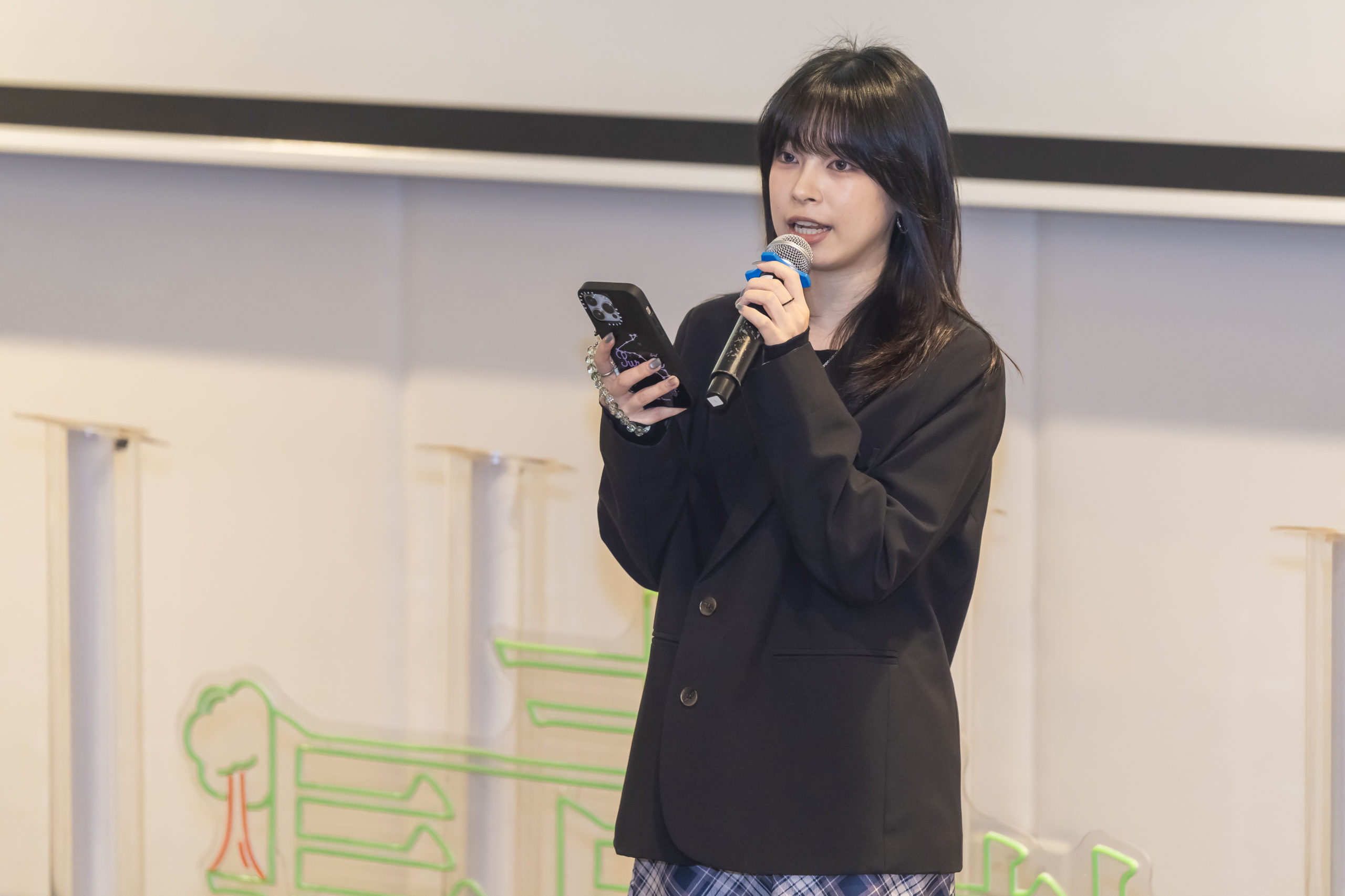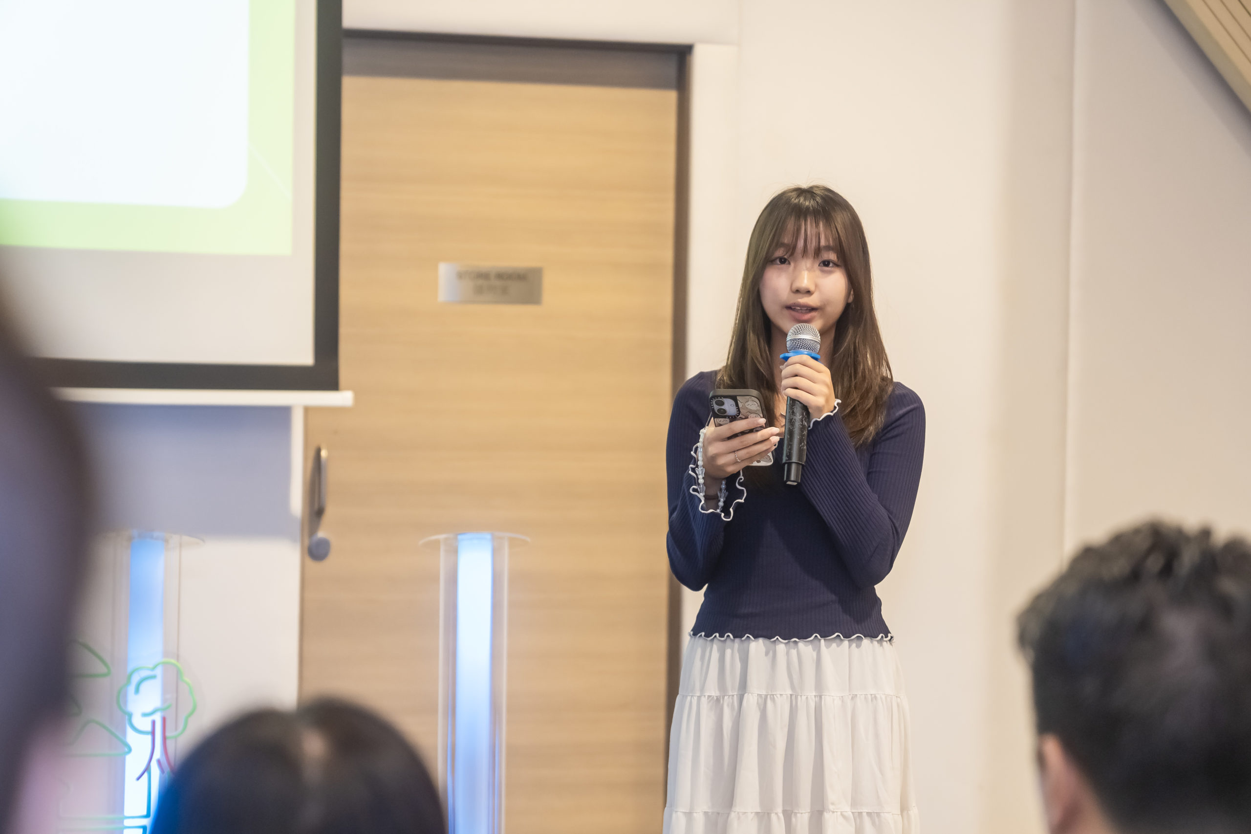 上年度參與義工服務的中文系蔡悅彤同學,向嘉賓及新一屆義工分享經歷。她形容計劃提供很多接觸長者的機會,透過陪伴與幫助,滿足他們的日常需要。蔡同學負責資訊科技範疇,曾於今年4月的「老友記大學體驗日」為60位長者介紹VR服務。