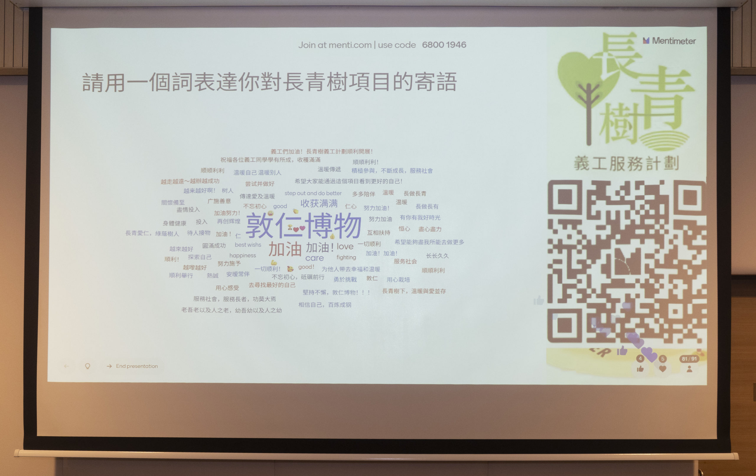 協理副校長(學生事務)葉秀燕女士致辭時表示,仁大作為一所秉持儒家價值觀的私立大學,致力在不同領域實踐與弘揚儒家思想,同時鼓勵學生參與義工服務,為有需要的長者提供陪伴與照顧,履行社會責任。葉女士提到,長青樹義工計劃於上年度取得鼓舞成果,50位義工同學累積服務時數達610小時,參與女青年會舉辦的32項義工服務,共提供238次服務。加上組織了兩個大型活動,同學服務長者人次近1,500。今年仁大繼續與基督教女青年會合作,並再次獲得「悟宿基金會」支持,選出60位同學參與義工計劃,服務內容包括探訪長者、舉辦節慶活動、教導長者使用電子設備、維修家具等。